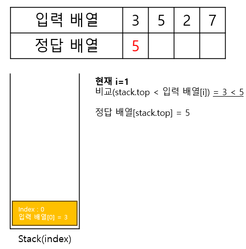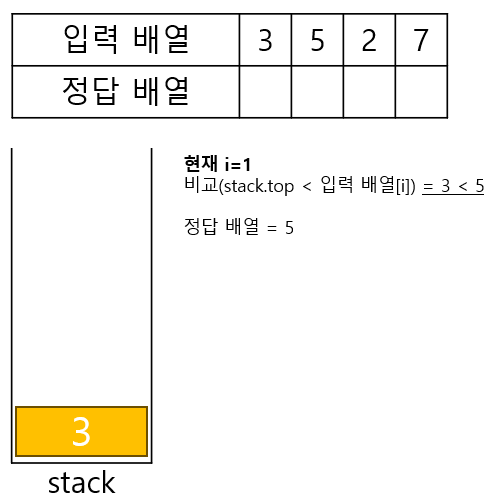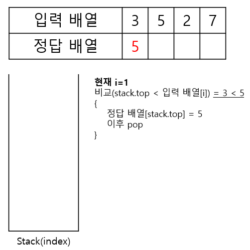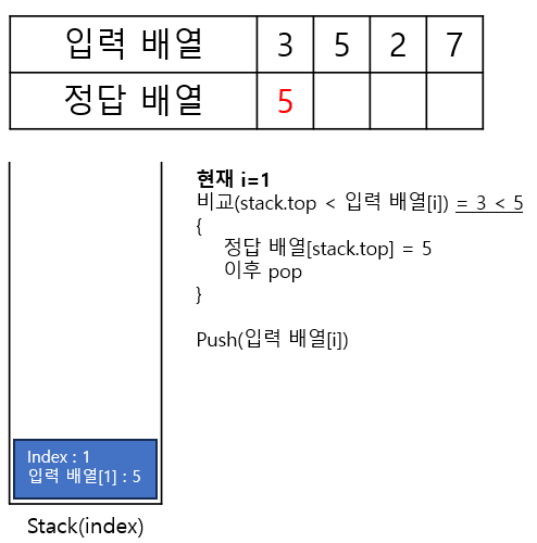 이제 현재 i가 1이고, 입력 배열[1]은 다음 오큰수를 찾아야하는 특정 수 이기 때문에, 이 수를 stack에 넣어 줍시다.
