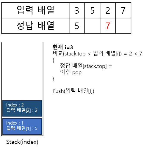 이제 i가 3이 되면서 보니, 2의 오큰수가 7인 것을 발견했습니다.