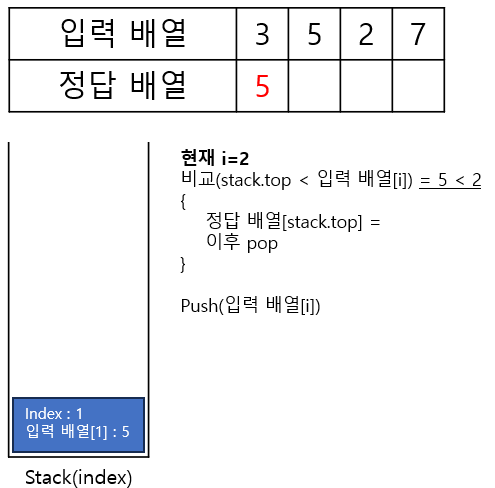 따라서 이를 스택에 잠시 대기 해주고, 5와 비교한 2 즉 입력 배열[2]를 스택에 push해 줍니다.