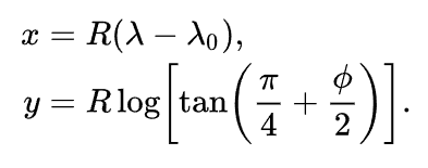 y = 반지름 * log[tan(파이/4 + 위도/2)]